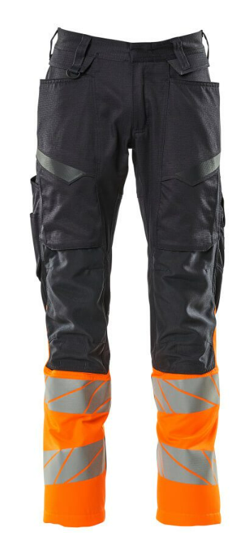 Fluoreszierende Kontrastfarbe und mit Reflexen. Zweifarbig. Teile des Produktes sind aus Stretchstoff. Kombination der leichten Stoffqualität 236 und ULTIMATE STRETCH Stoffqualität 511. Zweifache Kappnähte an den Beinen und im Schritt. Verdeckter Knopfverschluss. Hosenbeine sind ergonomisch geformt. Gürtelschlaufen. D-Ring. Hosenschlitz mit Reißverschluss. Vordertaschen. Verstärkte Gesäßtaschen. Verdeckte Hammerschlaufe auf der rechten Seite. Zollstocktasche, verstärkt. Taschen mit Patte vorne am Oberschenkel. Knietaschen aus strapazierfähigem CORDURA® (500 D), höhenregulierbar. Einfache und individuelle Regulierung der Knietaschenhöhe. Schenkeltasche mit Handyfach, Patte und verdeckten Druckknöpfen. Mit Druckeffekten. Vorbereitet für Hängetaschen 19450-126, die mit Knöpfen befestigt werden. Die Schrittlänge kann durch Auftrennen der inneren roten Naht ab Beinabschluss um 3 cm verlängert werden. Zusammen mit dem Knieschutz Typ „Large“ gemäß EN 14404-3 mitzertifiziert.